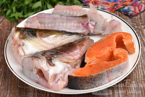 1. Суп с горбушей и пшеном. Для приготовления беру голову (жабры заранее удалила) и хвостовую часть горбуши (вес целой тушки 1,2 кг). Рыбу отправляем в кипящую воду (чуть больше 2 литров), снимаем пену, добавляем соль, лавровый лист, молотый перец и варим на медленном огне 15 минут.