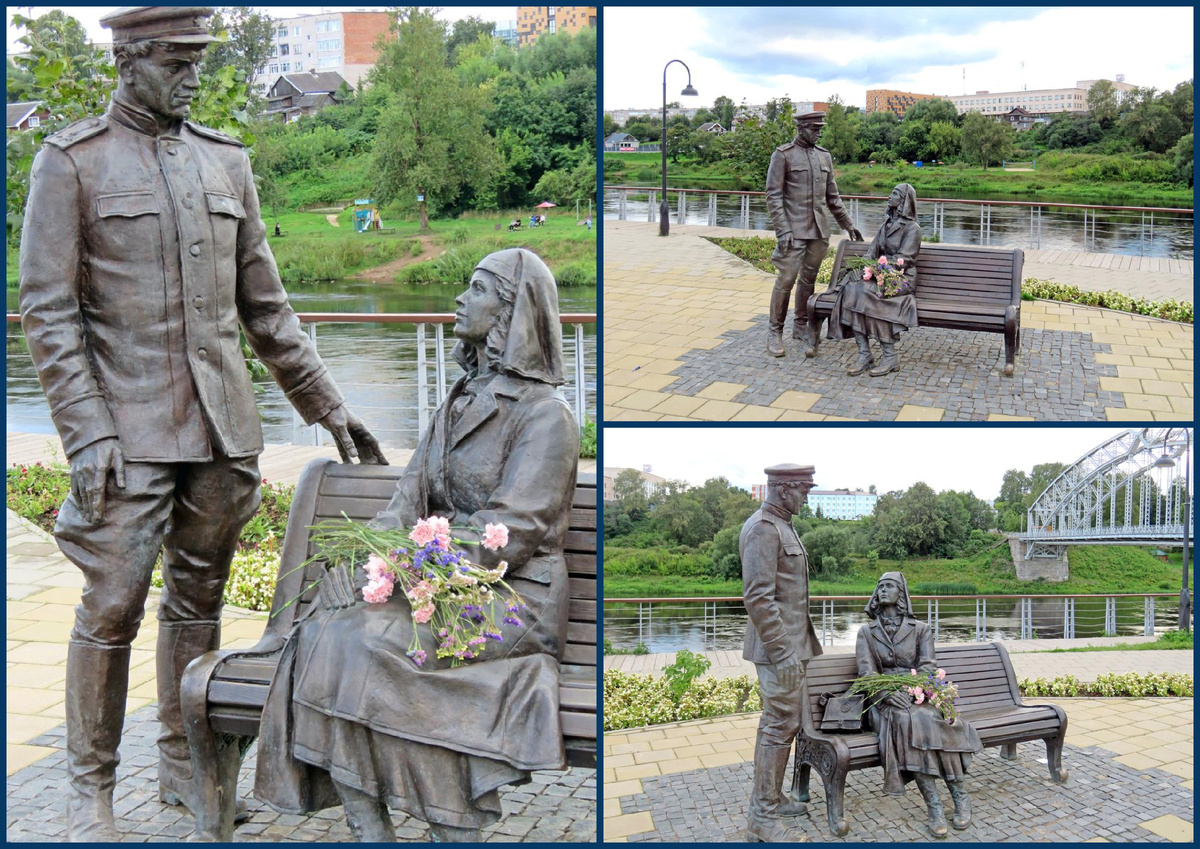 Девушка-медсестра, сидящая на скамейке, и стоящий рядом офицер видны издали и сразу притягивают взгляд. Красивая пара. Интересный памятник. Необычная жанровая скульптура. Просто сюжет для романа. Если подумать, то и уже написанные книги о любви, вспыхнувшей среди госпитальных стен, можно отыскать. Однако у боровичских «Красноармейца и медсестры» есть живые прототипы, история которых - готовый сюжет для романа. Местная администрация на вопросы о памятнике, открытом 05.07.2022 года, отвечает: «Инициатива изготовления и дальнейшей установки скульптурной композиции «Красноармеец и медсестра» принадлежит губернатору Новгородской области А.С. Никитину, в связи с присвоением г. Боровичи звания «Город трудовой доблести». Скульптор — Серёжин С.В.». Если отойти от сухого языка протокола, можно восхищаться трогательной и яркой историей любви будущего Маршала Советского Союза Дмитрия Тимофеевича Язова и его жены Екатерины Фёдоровны (в девичестве Журавлёвой). В качестве медицинской сестры Екатерин