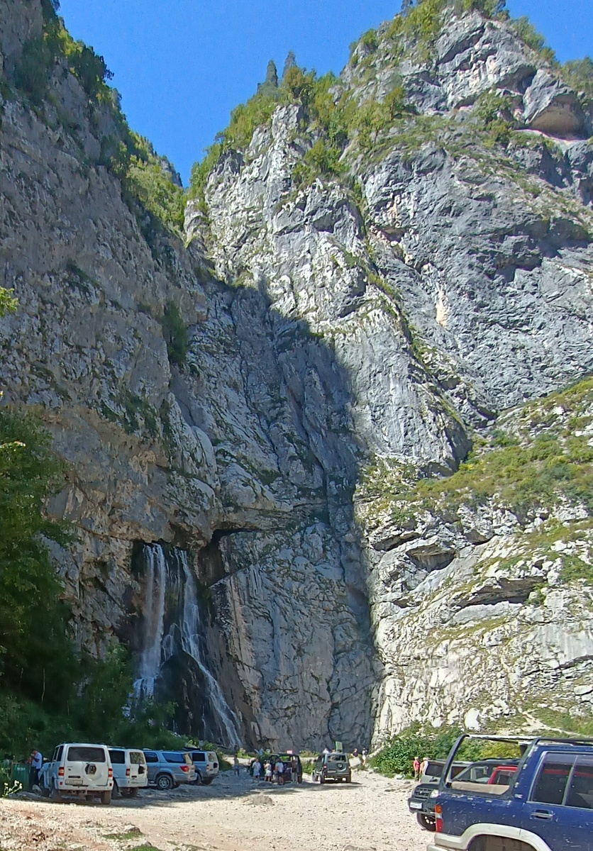 Эта экскурсия приглянулась тем, что за один день нам обещают показать несколько основных достопримечательностей Абхазии. Да еще бесплатная дегустация чая, алкоголя, сыра и колбасы, мёда! Стоимость - 2800 с человека. Водитель заехал за нами в 8 утра. Путешествие на УАЗ Патриот на восемь пассажиров с открывающимся верхом, что позволяет встать и воспринимать проезжаемые красоты более ярко Первая остановка – водопад «Девичьи слёзы». Вода в это время года течёт настолько тоненькими струйками, что на фотографии и не видно А видео с этой поездки я прикреплю в конце статьи Дальше нас завезли на дегустацию. Много вина, ликёров, коньяка, чачи, если не пропустить ни одного угощения, можно там остаться – ноги ходить откажутся! Конечно, всё это рассчитано на то, что мы размякнем и чего-нибудь приобретём – там же и чай, и сыры с колбаской. А знающие люди уже разведали, что на рынке в 2-3 раза дешевле тот же сыр. На территории Рицинского национального парка посетили водопад влюбленных. Можно спуст