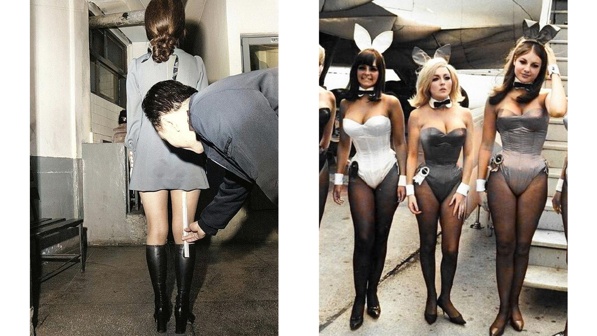 Зайчата на взлёте! Вот они—пять английских «девочек-зайчиков» рассекают по лондонскому аэродрому в культовых ушах и хвостах после стажировки в Чикаго. Что ни деталь — модное шоу: атласные корсеты, игривые бантики, самоуверенные улыбки и редкая для шестидесятых свобода стиля. Какая смена декораций после строгих британских форм!