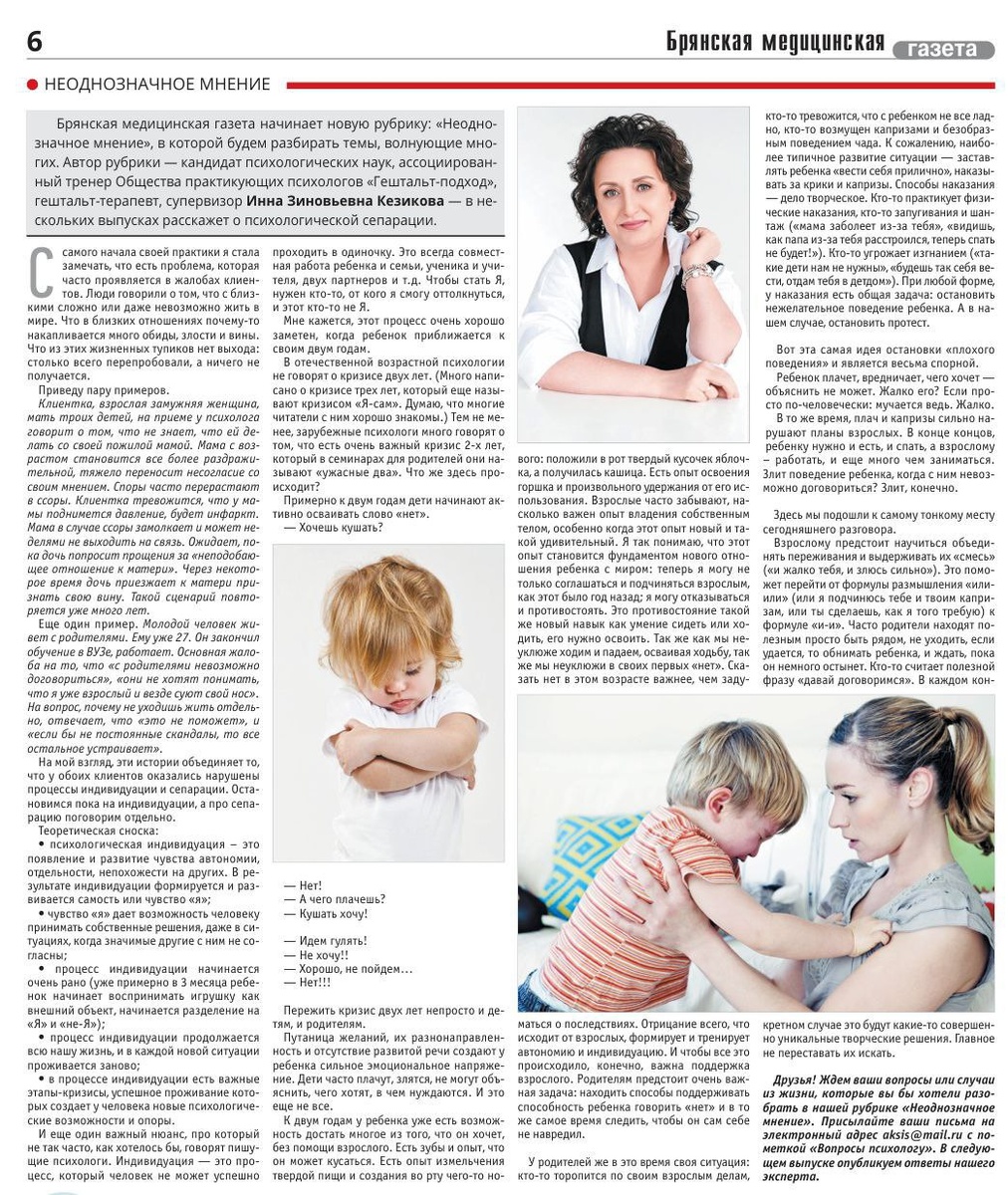 Друзья! Ну, вы помните, сегодня карета превращается в тыкву. "Утюг" начинает психологическое вещание. Пока без мемов. Посерьезнее. На прошлой неделе в "Брянской медицинской газете", редактором которой является моя коллега и однокурсница Саша Сидачева состоялась премьера рубрики "Неоднозначное мнение". Автор рубрики - наш психологический брильянт Инна Кезикова, её сегодняшний статус и прочие регалии - в материале. А сам материал - во вложении. Сегодня он о психологической сепарации. Уважаемые сыновья, вы уже отделились от мам?)) Если вас трогает тема, есть какие-то общие или частные вопросы к психологу, можно написать их под этим постом. Тем, кто знает Инну и Сашу, не надо объяснять, насколько это крутая возможность получить на вашу тему "неоднозначное мнение" от профи на страницах газеты. ДумОйте! И пишите! А я ныряю в трехдневку.