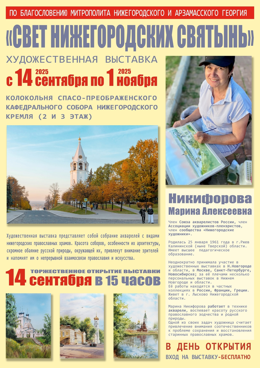 в Соборной колокольне нижегородского Кремля открылась выставка Марии Никифоровой «Свет нижегородских святынь». Это серия акварелей, изображающих православные храмы нашего края. До 1 ноября.