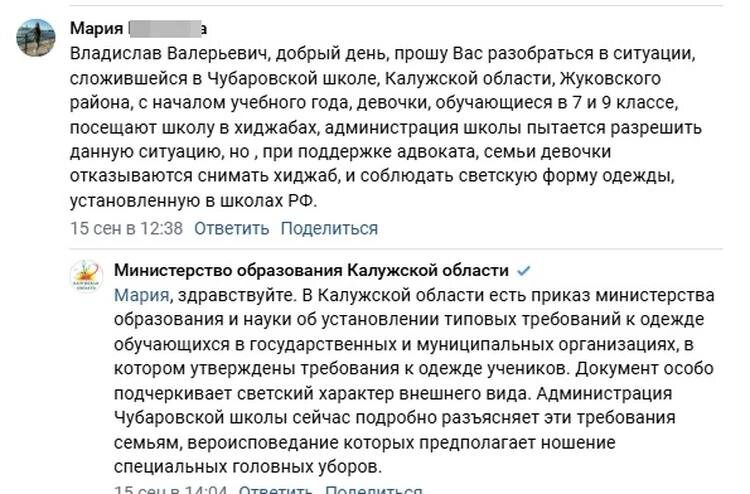Очередной скандал с хиджабом в школе На этот раз - в Калужской области. Жительница деревни Чубарово в Жуковском районе Калужской области обратилась к губернатору Владиславу Шапше с жалобой на одноклассниц своего ребенка, которые ходят в школу в хиджабах. Женщина по имени Мария оставила комментарий на странице главы региона в соцсети ВК, в котором рассказала, что в их сельской школе девочки из седьмого и девятого классов с начала учебного года стали приходить на занятия в этой одежде. Ну, то есть, раньше девочки как-то обходились без хиджабов, а тут вдруг что-то случилось, и они начали резко соблюдать религиозные нормы в светской школе. Ощущение, что подобные инциденты по всей стране - это не случайность, а искусственно создаваемые конфликтные ситуации. Через какие-нибудь паблики, где людям навязывают такую манеру поведения. При этом они отстаивают ее с помощью юристов и адвокатов. На обращение отреагировало министерство образования Калужской области. Чиновники подтвердили, что к шк
