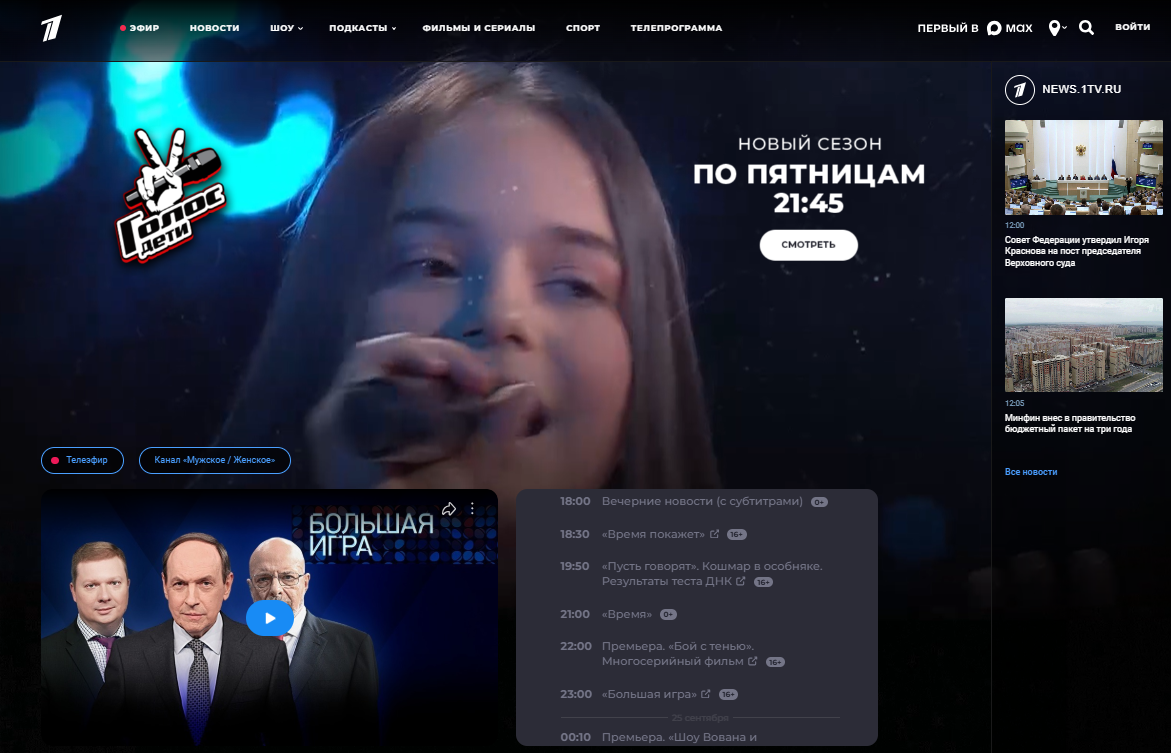 Главный федеральный канал с самым широким охватом. Фокус на масштабные государственные проекты, информационные программы, главные премьеры российских сериалов и развлекательные шоу-хиты.