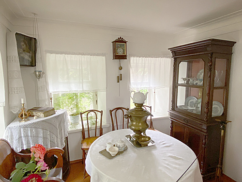 Самое интересное начинается с гостиной. Это самая большая комната, служившая в то время столовой, гостиной и одновременно рабочим кабинетом отца Чехова. Мы видим обстановку небогатой купеческой семьи того времени. Вот посуда, которая стояла на столе Чеховых, а графин, пивная кружка принадлежали лично А.П. Чехову.