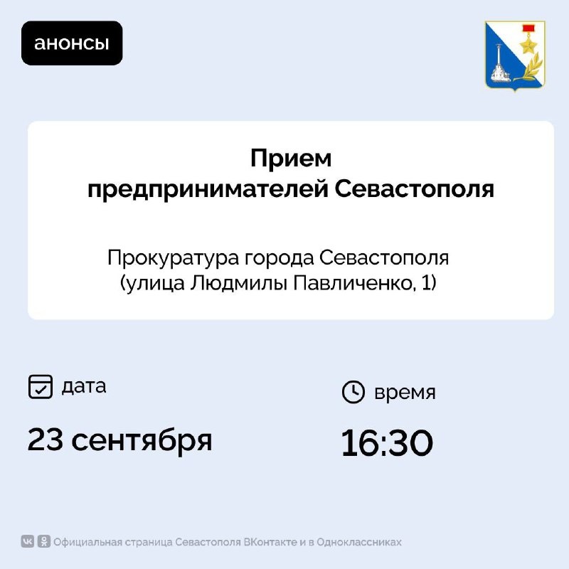 Проводим мероприятия для предпринимателей Севастопольских предпринимателей приглашают на личный приём вице-губернатора Марии Литовко, первого заместителя прокурора Дмитрия Теллина, бизнес-омбудсмена Ильи Пестерникова и руководителей профильных департаментов. Вы узнаете как защититься от необоснованных проверок, решить бюрократические вопросы, получить необходимые документы и обеспечить исполнение контрактов. Приём пройдёт в прокуратуре города по адресу ул. Людмилы Павличенко, 1. Предварительная запись — до 20 сентября по ссылке или по телефону +7 (8692) 99-97-03. Подписывайтесь на наш канал в МАХ