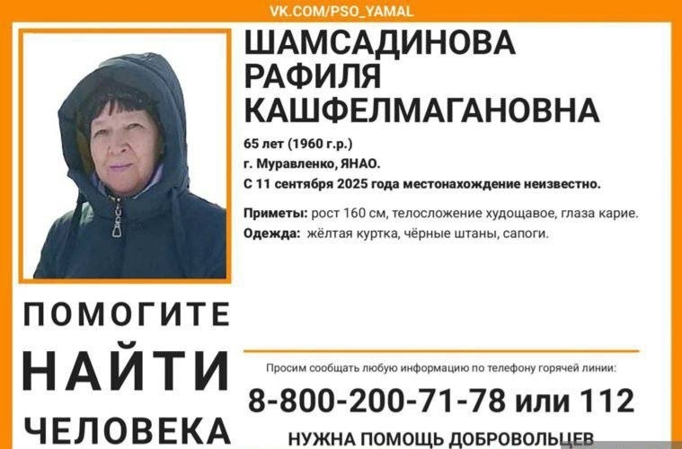 С 13 сентября продолжаются активные поиски пенсионерки, родившейся в 1960 году, пропавшей в окрестностях Муравленко. Женщина отправилась собирать грибы в районе Сугмутского месторождения, оставив мобильный телефон дома. Ее точное местоположение остается неизвестным. Для участия в поисковых мероприятиях привлечены сотрудники правоохранительных органов.