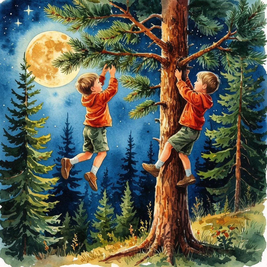 Они обрушились на нижние ветки с таким грохотом, что, мне показалось, в соседней области люди проснулись. Мы замерли, прислушиваясь, не бежит ли сторож. Но пронесло — лишь испуганно вспорхнула с ближней ели какая-то птица. А главное — о чудо! — ветви были густые и пружинистые. Они, как пара парашютистов, плюхнулись в самое густое место, отскочили от него и скатились по другим веткам прямиком на землю, в мягкий мох. Лежали там, отдувались и смотрели на звёзды.