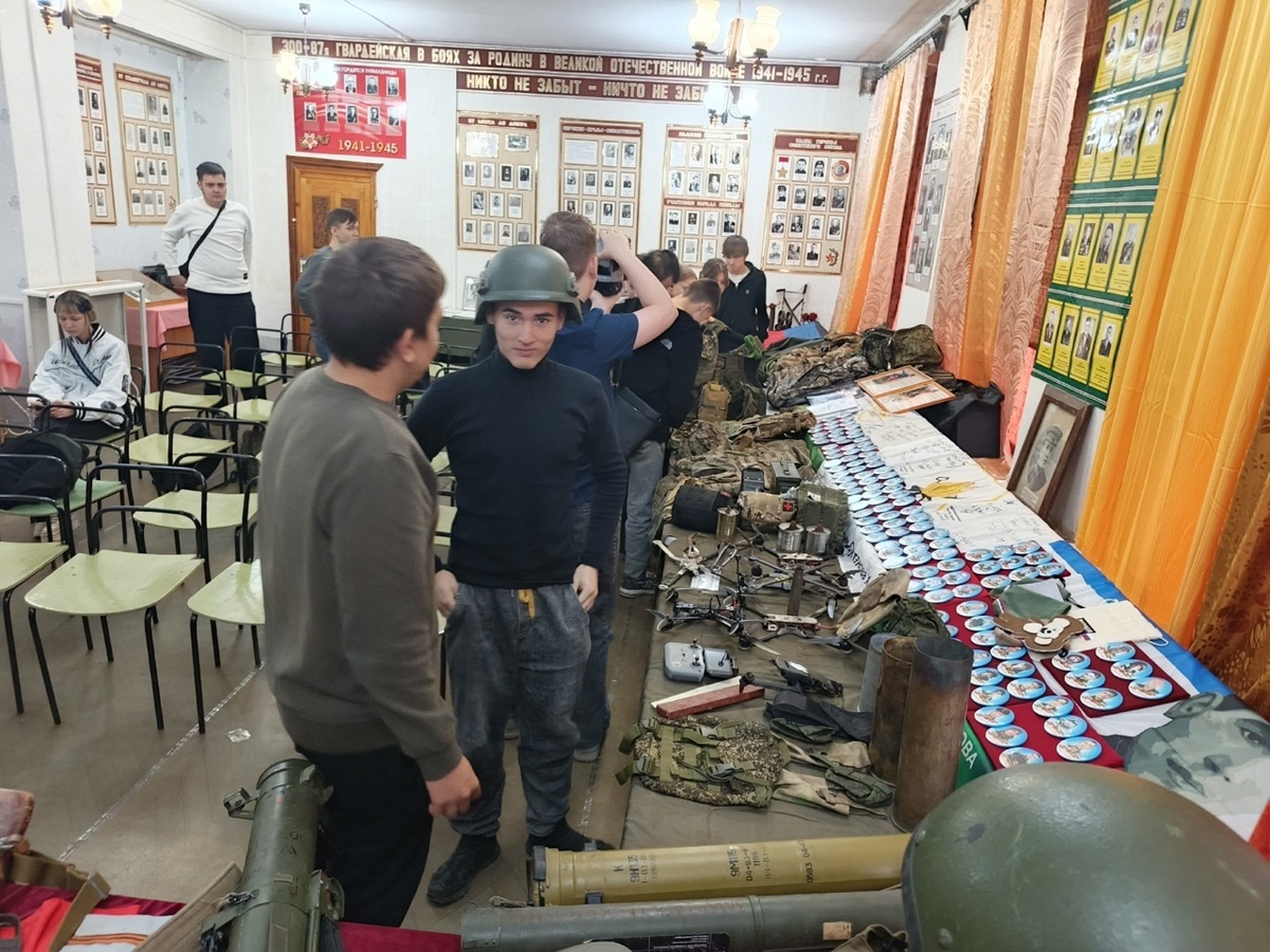 Экспозиция посвящена истории специальной военной операции. В музее Туймазинского индустриального колледжа заработала экспозиция «СВО. Время героев», посвященная истории специальной военной операции. Здесь можно увидеть обмундирование, личные вещи военнослужащих СВО, трофейные предметы. А еще – значки с портретами героев, которые музею подарили родственники погибших на спецоперации туймазинцев. Экспозицию организовал советник директора индустриального колледжа, руководитель Туймазинского поискового движения Юрий Бирюзов. Он знакомит студентов с экспонатами, рассказывает о своей работе в добровольческой бригаде «Барск-Курск» в Курской области. Он вернулся оттуда в конце августа после завершения контракта. Фото: соцсети колледжа.