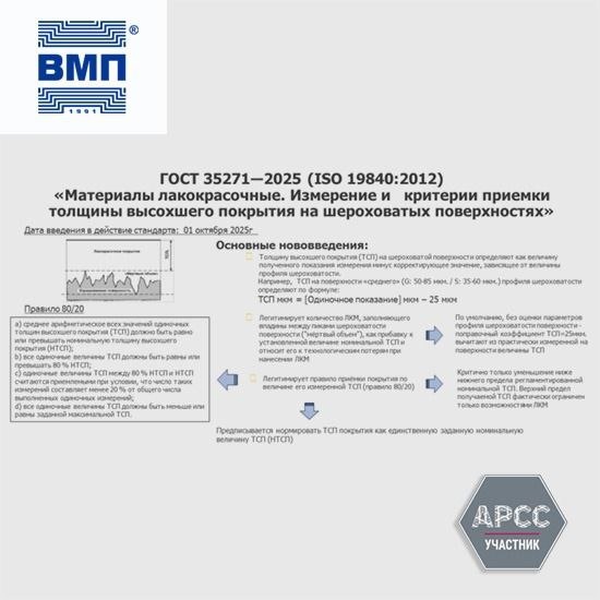 #новостипартнеров ❗️С 1 октября 2025 года вступает в силу национальный стандарт ГОСТ 35271–2025 (ISO 19840:2012) «Материалы лакокрасочные. Измерение и критерии приемки толщины высохшего покрытия на шероховатых поверхностях». 📍Принятие этого документа является новым этапом в развитии системы оценки качества защитных покрытий в России и отражает активное участие ведущих отечественных производителей в формировании нормативной базы отрасли. 📍Документ был принят на основе проекта, разработанного и инициированного экспертами Научно-производственного холдинга «ВМП» (⚙️участник АРСС) — ведущего отечественного производителя защитных индустриальный покрытий. После введения в действие управление стандартом будет осуществляться Техническим комитетом по стандартизации 195 «Материалы и покрытия лакокрасочные» (ТК-195). Подробнее