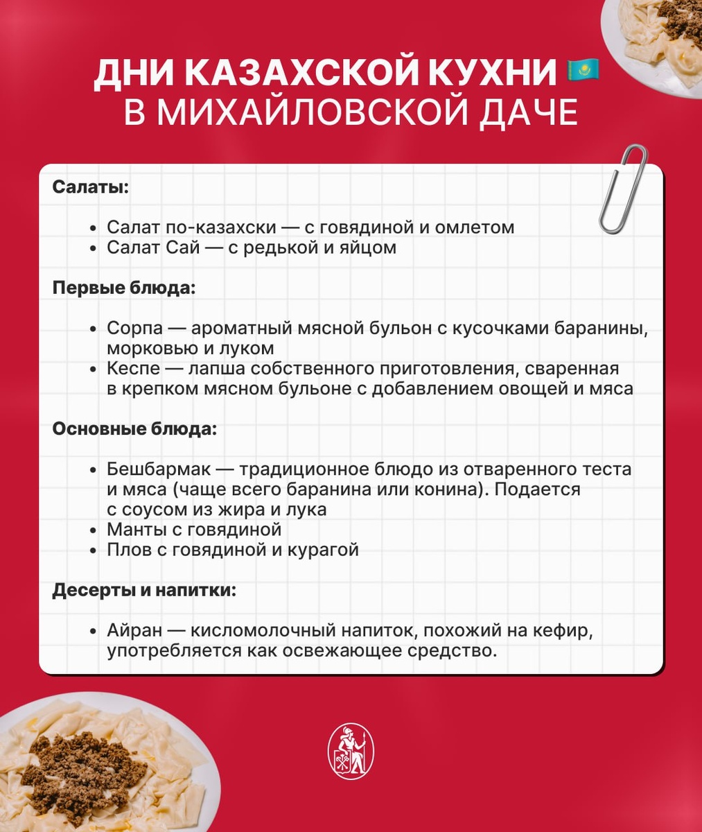 🦉 Столовая Михайловской дачи приглашает в гастрономическое путешествие. Уже на следующей неделе здесь стартуют дни национальных кухонь. И первая на очереди... барабанная дробь... казахская 🇰🇿 📌 С 20 по 26 сентября ждём всех на знаменитый бешбармак, ароматную сорпу и другие традиционные блюда. Меню прикрепили к посту. Ставьте ❤️, если у вас уже текут слюнки! ⭐ Сможете угадать, какая национальная кухня ждёт вас дальше? Пишите варианты в комментариях и следите за новостями, чтобы не пропустить новое меню.