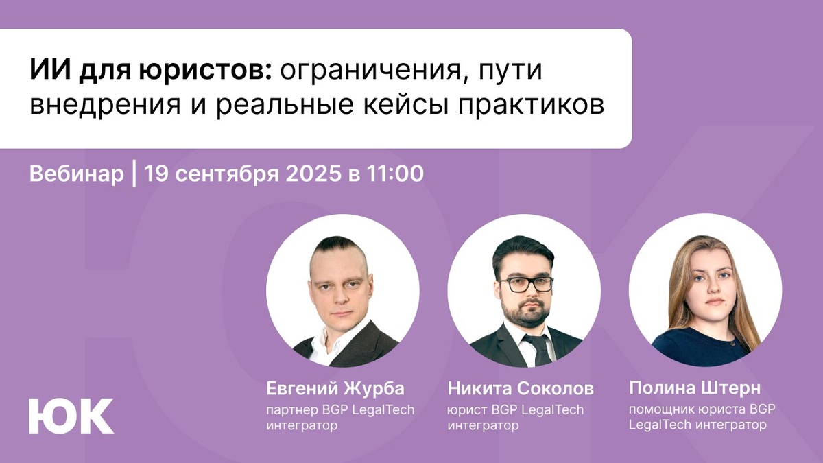 Вебинар на тему: «ИИ для юристов: ограничения, пути внедрения и реальные кейсы практиков» скоро начнется LegalTech интеграторы из BGP разберут правовые и этические ограничения, безопасные подходы, реальные кейсы и шаги, которые помогут юрдепу решать свои задачи с помощью ИИ. 👤 Спикеры: Евгений Журба, партнер BGP LegalTech интегратор; Никита Соколов, юрист BGP LegalTech интегратор; Полина Штерн, помощник юриста BGP LegalTech интегратор. ➡️ Регистрируйтесь по ссылке, чтобы подключиться к прямому эфиру и после вебинара получить запись. 🟣 Подписаться на канал «Юрист компании»