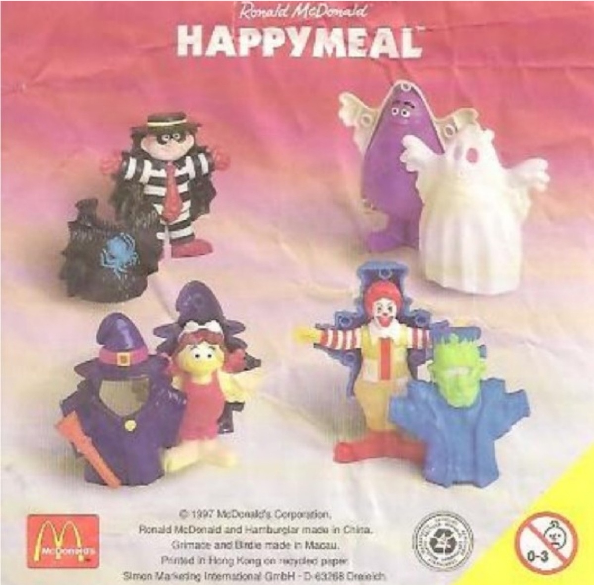 В этой серии игрушек представлен всеми любимый Рональд Макдональд и его друзья, которые готовятся к празднованию Хеллоуина. В наборе 4 игрушки в нарядах: 1. Воришка Гамбурглер в наряде летучей мыши. 2. Гримас в наряде призрака. 3. Бирди в наряде ведьмы. 4. Рональд Макдональд в наряде Франкенштейна. В моей коллекции есть следующие игрушки: Если интересуют другие игрушки из McDonald's , то переходим на Главную страницу