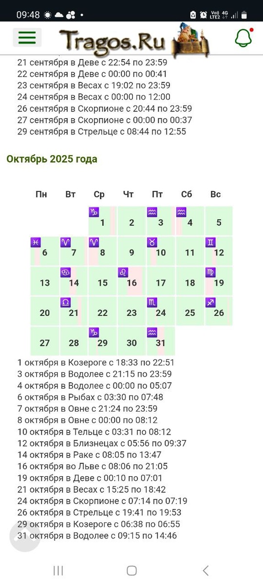 Дорогие друзья! В разделе ЛУНА БЕЗ КУРСА мы ввели наглядный календарь ✨ Там где Луна без курса, обозначили этот промежуток времени красным цветом. Также указали Знак Зодиака, в котором находится Луна без курса. Под самим календарём прописаны даты и периоды Холостой Луны Ссылку на обновлённый раздел оставлю здесь 🌙 https://tragos.ru/astrology/luna-bez-kursa