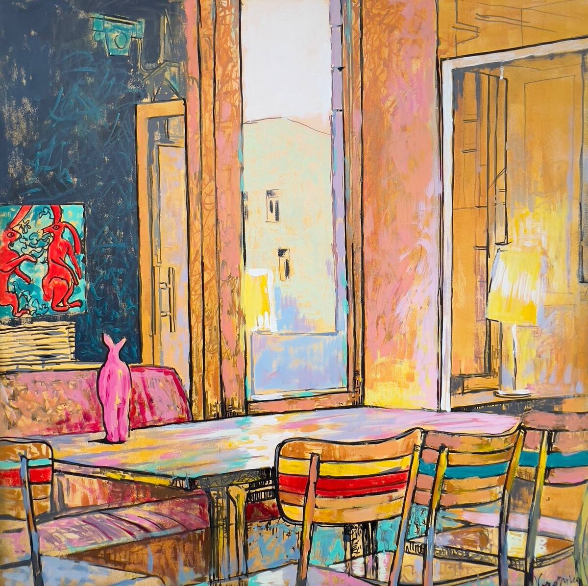 Вернисаж серия «В поисках Голодной Утки» 80х80 холст/акрил 2025 ••• «Вернисаж», пожалуй, самая сложная по архитектуре работа. Высокое окно, разделяющее картину пополам, заполняет пространство светом и, за счет вертикальных граней, добавляет эффект дробления пространства. Мы как будто находимся в зеркальном кубике, где все не так, как кажется. Впечатление усиливается, когда мы начинаем рассматривать героя. Сначала это выглядит, как огромный зал фантастического музея, где Матисс, по-видимому заяц, и его «Танец» исполняют пушистые звери. Но вдруг оказывается, что зайчик - это игрушечная фигурка, забытая кем-то в кафе на столе, а картина на стене, просто шутка декоратора. ••• Встретить розового зайца и обсудить с ним проблематику московского ресторанного мира, можно в галерее YOLKA art до 10 октября 2025 года. ••• Москва. Ходынский бульвар 20а, с 11:00 до 21:00 ежедневно. Выставка бесплатная, работы продаются. Вся контактная информация на сайте YOLKA.art