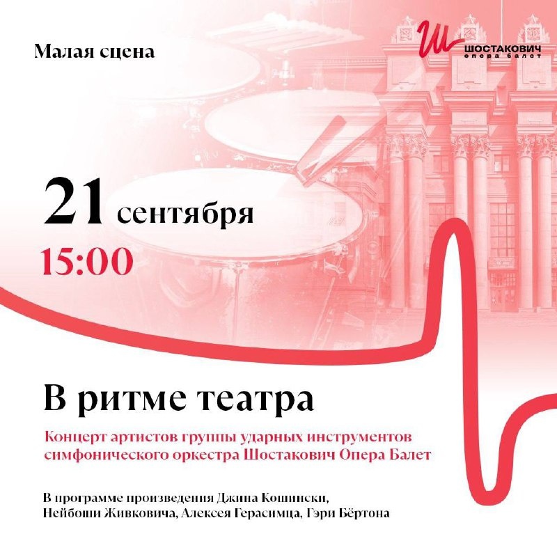 Дорогие зрители, приглашаем вас на увлекательный концерт ударной музыки «В ритме театра». В этот вечер артисты группы ударных инструментов симфонического оркестра театра выступят в необычной роли солистов, представив как оригинальные современные произведения, так и переложения известных композиций. Концерт будет включать в себя исполнение не только на традиционных ударных инструментах, но и использование неожиданных бытовых предметов в качестве музыкальных инструментов. В программе прозвучит музыка композиторов-перкуссионистов Джина Кошински, Нейбоши Живковича, Алексея Герасимца, а также джазового вибрафониста Гэри Бёртона. Произведения композиторов впервые будут исполняться в Самаре! Предстоящий концерт ударной музыки, который пройдёт 21 сентября на Малой сцене театра, обещает стать захватывающим событием. Не упустите возможность окунуться в мир ударных ритмов, насладиться мастерством исполнителей и зарядиться яркими впечатлениями! Билеты онлайн по ссылке: https://away.vk.com/aw