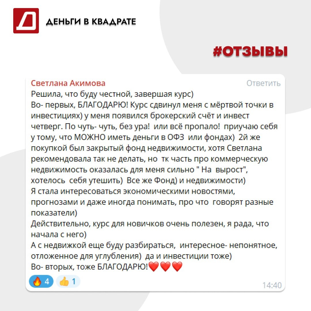 ✨ «Решила, что буду честной…» — так начинается отзыв одной из учениц первого потока экспресс-практикума «Яйца в разные корзинки». Светлана пришла на курс с ощущением, что инвестиции — это что-то сложное и «не для нее». А вышла с конкретными результатами: ✔️ открыла брокерский счет ✔️ завела традицию «инвест-четвергов» ✔️ приучает себя спокойно держать деньги в ОФЗ и фондах ✔️ купила первый фонд недвижимости (пусть и немного «на утешение», но уже действие!) ✔️ стала разбираться в экономических новостях и понимать, о чем говорят показатели «Для новичков курс очень полезен, я рада, что начала именно с него!» — пишет она. 💡 Инвестиции — это не про героизм и «все или ничего». Это про шаги. Маленькие, но регулярные. Это про то, чтобы снять страх и начать действовать. 📌 Уже 1 октября стартует 2 поток «Яйца в разные корзинки»: https://denowa.online/onlajn-kurs-v-raznye-korzinki/ Если вы давно хотели навести порядок в финансах, понять, что куда раскладывать, и перестать держать все яйца в