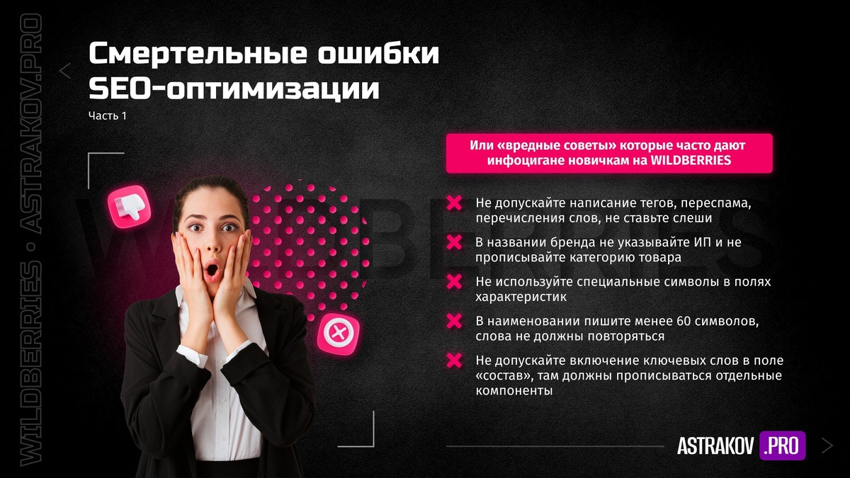 Проверьте себя, у вас есть ошибки как на этих двух слайдах? (я их взял из презентации к вебинару «SEO на WILDBERRIES «умерло»? – Новые