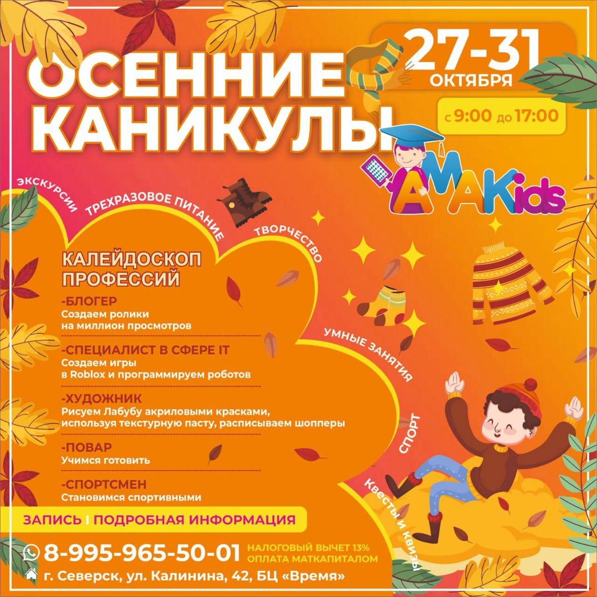 🍁 ОСЕННИЕ КАНИКУЛЫ, КОТОРЫЕ ХОЧЕТСЯ ПОВТОРИТЬ! С 27 по 31 октября — в AMAkids! ✨ Пока другие скучают дома, ваш ребенок: 🚀 Погружается в мир будущих профессий 🎨 Создает арт-шедевры, как настоящий художник 🎮 Программирует роботов и игры в Roblox 🎥 Снимает ролики, которые могут набрать миллион просмотров 👩🍳 Учится готовить, как мастер-шеф 🏅 Прокачивает выносливость на спортивных челленджах 🎁 Каждый день — новые открытия, экскурсии и мастер-классы! 💡 Почему выбирают AMAkids? ✅ Мини-группа — внимание каждому ✅ Авторские методики — учим через игру ✅ Творчество, движение и IT — всё в одном месте ✅ Уют, безопасность и забота о детях 📆 5 насыщенных дней ⏰ С 9:00 до 17:00 🍽 Трехразовое питание 📍 г.Северск, ул. Калинина 42, БЦ «Время» 💰 Цена 8000 рублей! ⚡Мест все меньше — бронируйте сейчас: 📞 8(995)965-50-01 💬 wa.me/+79959655001