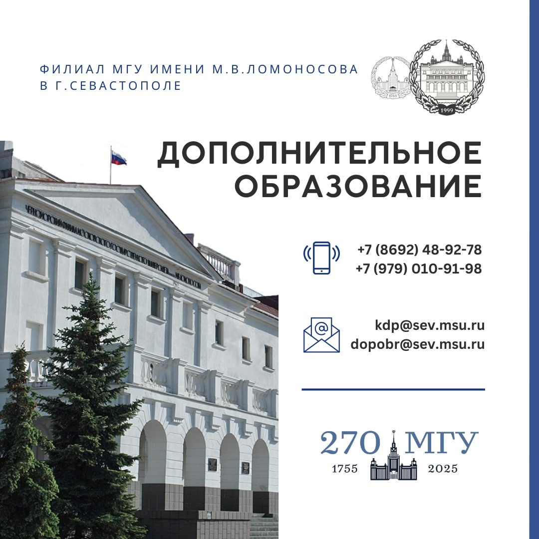 Уважаемые специалисты с высшим и средним профессиональным образованием! Завершается прием заявлений на обучение по программам профессиональной переподготовки: ✅ Государственное и муниципальное управление; ✅ Экономика и управление в индустрии туризма и гостиничного бизнеса; ✅ Практическая психология и современные методы психотерапии. Также продолжается прием заявок и комплектация групп на остальные программы профессиональной переподготовки и повышения квалификации, представленные на сайте филиала МГУ в г. Севастополе. Подробнее ознакомиться со стоимостью обучения и программой курсов можно пройдя по ссылке: https://vk.cc/cPAuid Запись осуществляется по телефонам: ☎️ +7 (979) 010-91-98 +7 8692 48-92-78 ⌨️ и электронной почте: kdp@sev.msu.ru Начните путь к профессиональному росту и развитию вместе с филиалом МГУ в г.Севастополе! #объявления_севмгу #дополнительное_образование #cевмгу