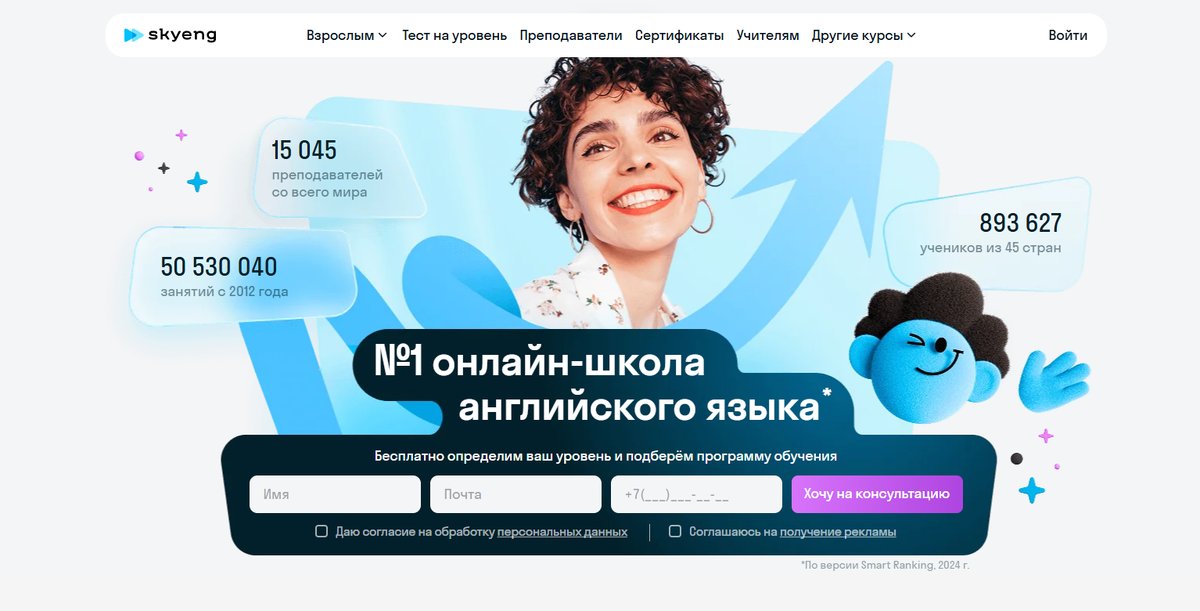 Преимущества: гибкий график, индивидуальная программа, носители языка, круглосуточный доступ.