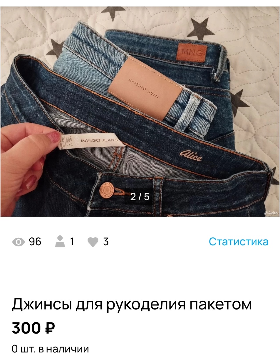 Недавняя находка. Было много джинсов, но эти потёртые и для носки нельзя продавать , хоть фирмы и хорошие. Купили быстро, за два дня. В профиле у покупателя куча кастомизированных джинсов, поэтому как привезу с дачи ещё кучу джинсов на рукоделие напишу ему сама с предложением купить сразу всё.