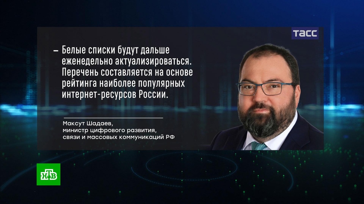 [ Смотреть видео на сайте НТВ ] «Белый список» сайтов включает ресурсы, которые будут работать даже при ограничениях работы интернета, вызванных соображениями безопасности. Минцифры будет еженедельно обновлять «белый список» сайтов и сервисов, которые будут работать даже при ограничениях в работе интернета. Об этом сообщил глава Минцифры Максут Шадаев в кулуарах форума Kazan Digital Week. Министр пояснил, что список составляется на основе рейтинга наиболее популярных интернет-ресурсов России», Актуальная версия списка включает «Госуслуги», «ВКонтакте», «Oдноклассники», Mail.ru, Max, сервисы «Яндекса», Ozon, Wildberries, «Авито», «Дзен», RuTube, сайт платежной системы «Мир», сайты правительства и администрации президента, федеральную платформу дистанционного электронного голосования. Также в списке личные кабинеты операторов МТС, «Билайн», «Мегафон», «Ростелеком» и принадлежащий ему T2. Минцифры сообщало, что далее в перечень ресурсов, доступных в условиях ограничения мобильного интерне