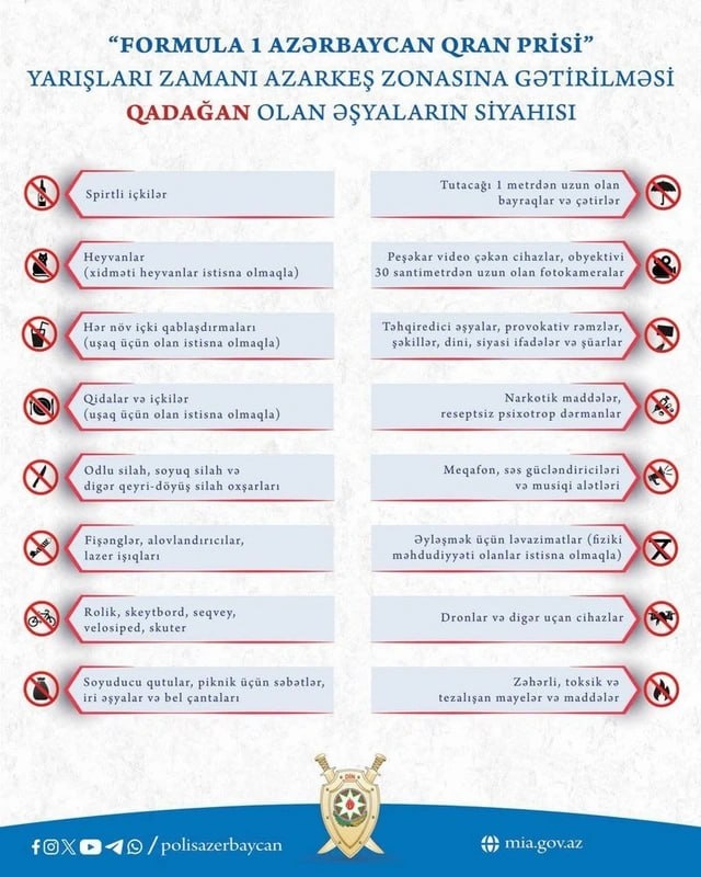 ❓ Что нельзя брать с собой в фан-зону "Формулы-1"? Министерство внутренних дел (МВД) Азербайджана обнародовало перечень предметов, запрещенных к проносу в фан-зону во время гонок "Формулы-1". Как сообщает пресс-службa МВД, в целях обеспечения беспрепятственного и безопасного проведения стартующих сегодня соревнований Гран-при Азербайджана "Формулы-1" запрещено проносить определенные предметы. #ruoxuaz #ГранприАзербайджанаФормулы1 #Формула1 ✈️ Новости Азербайджана 🔗 Написать нам
