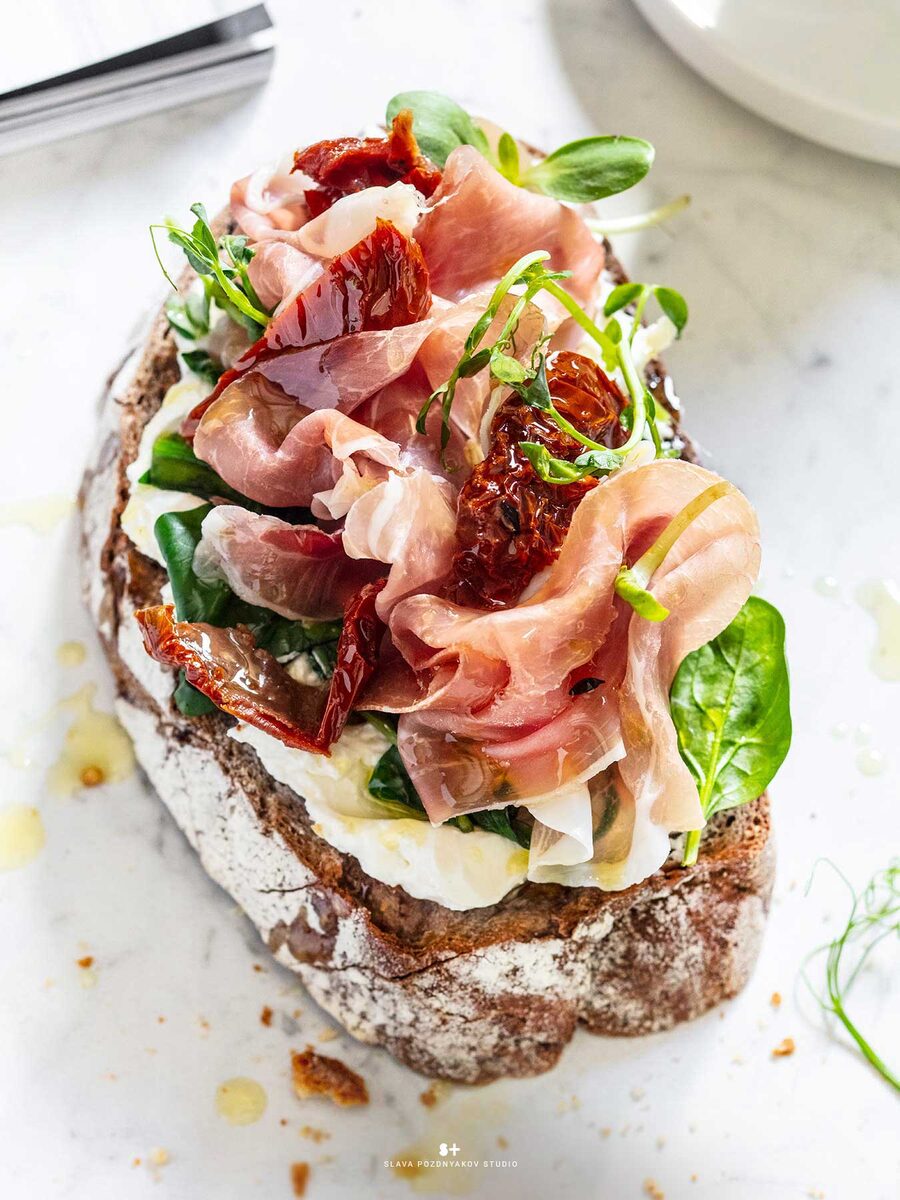 Фотосъемка брускетт для меню. Для создания интересных фотографий сэндвичей, брускетт и тостов важно сделать их аппетитными и подчеркнуть свежесть ингредиентов. Используйте только свежие и качественные продукты. Выбирайте хлеб, который хорошо выглядит на фото и гармонично сочетается с начинкой. Для фотосъемки используйте естественный свет — идеальный вариант, но если его недостаточно, используйте софтбоксы для мягкого рассеянного освещения без резких теней. Акцентируйте внимание на деталях: сочные овощи, расплавленный сыр, румяная корочка хлеба. Это подчеркнёт текстуру и свежесть. На чем снимать брускетт? Один из вариантов, на деревянной доске. Так же хорошо смотрится на мраморной доске. Если вы снимаете сэндвич, снимите его в разрезе, чтобы показать начинку. Крупный план будет привлекать к себе внимание. Можно добавить дополнительные элементы, такие как нож или вилка рядом с сэндвичем, чтобы сделать снимок более интересным. Разработка концепции, стилистики съемки и реализация проекта