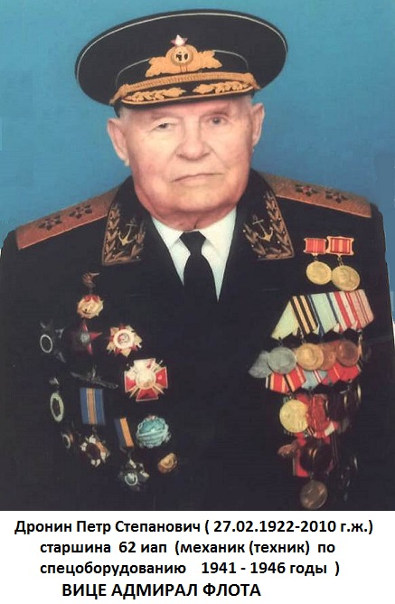 Герой моего рассказа Дронин Петр Степанович родился в Белоруссии в крестьянской семье 27 февраля 1922 г. в д. Хадечино Кличевского р-на Могилевской области. В июне 1940 г. в возрасте 18 лет поступает в Военно-морское авиационно-техническое училище в г. Пермь. Учеба продолжалась не долго, началась Великая Отечественная война и в ноябре 1941 г. состоялся досрочный выпуск курсантов. П.С. Дронин был направлен в район военно-морской базы г. Новороссийска на должность механика по спецоборудованию самолётов в 62-й истребительный авиационный полк, в котором прослужил до конца войны. Не буду подробно рассказывать о всех его заслугах, ордена и медали сами говорят за себя, а их у него не мало. Приведу выдержку из одного представления к награждению, которое подписано командиром 62 авп подполковником Щербаковым Николаем Тимофеевичем 15 сентября 1944 года. Оно практически подводит итог его боевой работы. Вот основные моменты этого представления : ( стиль написания и орфография соответствуют оригиналу) …