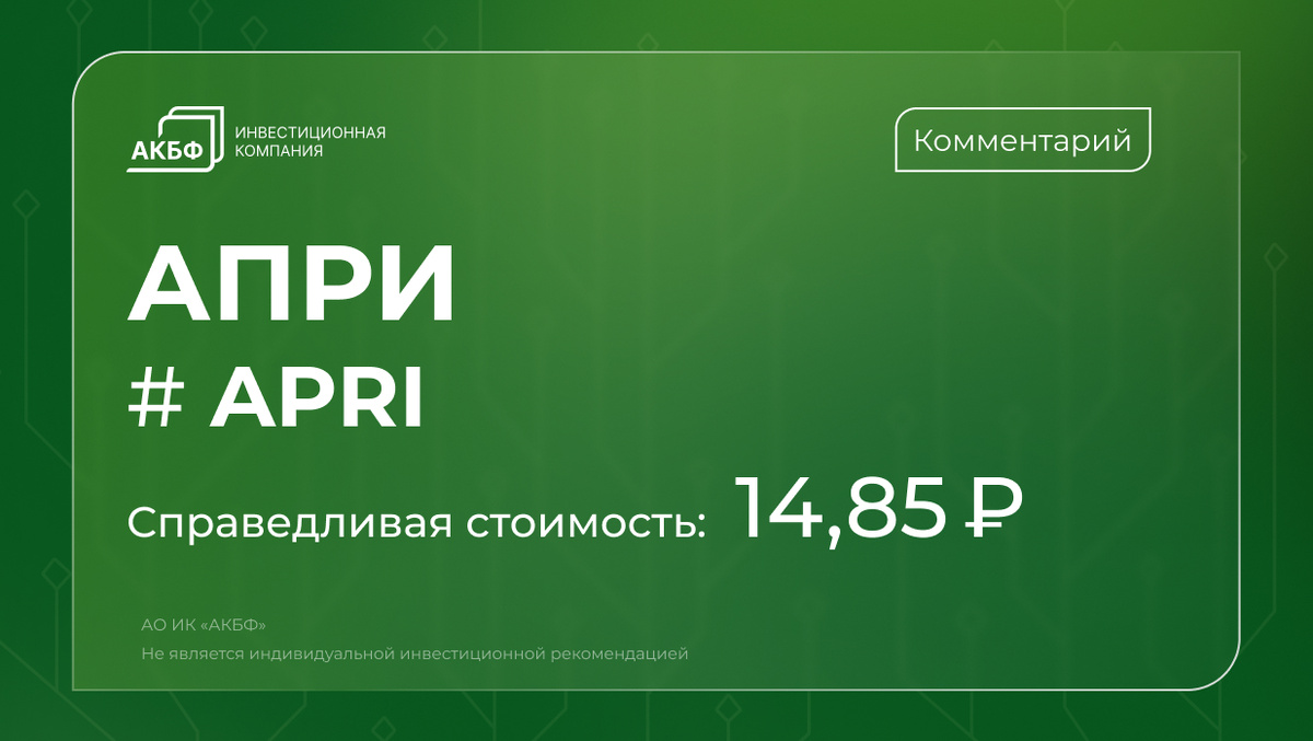 Расчётное значение справедливой стоимости обыкновенной акции ПАО «АПРИ» оцениваем на уровне 14,85 руб./ао, что предполагает 14%-й потенциал роста и рекомендацию «держать».