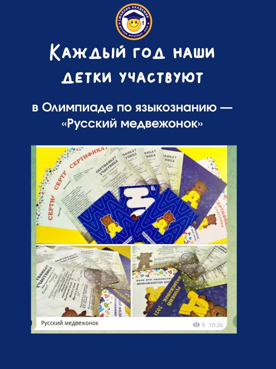 Скоро в «Смайлик Академии» стартует подготовка детей к Олимпиаде по языкознанию — «Русский медвежонок». И мы хотим рассказать, почему это полезно и важно для ваших детей. Почему это важно для детей? 1. Развивает гибкое мышление. Дети учатся искать системы, анализировать, строить логические цепочки. Эти навыки пригодятся не только в русском, но и в программировании, математике, даже в общении. 2. Учит ясно выражать мысли. Умение грамотно говорить и писать — это уверенность в себе, успех в учебе и будущей профессии (юрист, IT, врач, руководитель — везде это ценится!). 3. Открывает доступ к знаниям. Вся информация — в книгах и интернете — на русском. Понимать тонкости языка, легче учиться и развиваться. Как проходит участие? Не нужно ехать в другой город. Ваш ребёнок может: ✨ Прийти к нам в академию, ✨ Написать работу в комфортной обстановке, ✨ Получить сертификат участника. Всё организовано и отправлено организаторам нами. Удобно, безопасно, без лишних затрат. К Олимпиаде детей го