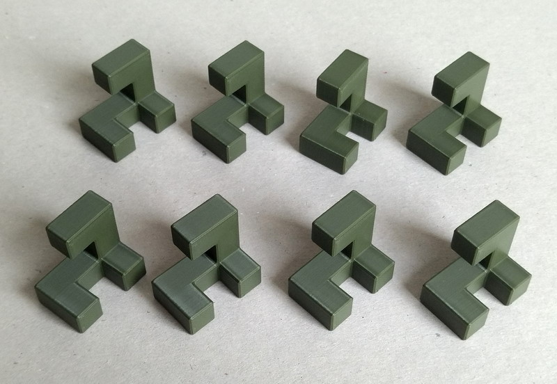 И, чтобы не пропадал довольно-таки недешёвый филамент, придумал ещё две разновидности головоломки "Собрать куб 4х4х4 из восьми конгруэнтных деталей". Головоломке я дал вполне назидательное название - "Ошибка III". Между прочим, свою самую первую головоломку я создал также в результате аналогичной ошибки - делал чужую головоломку и напутал. Чтобы не пропадать добру, пришлось придумывать что-то новое Своё...