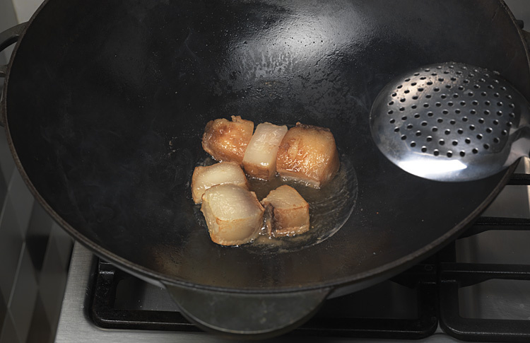 Вы можете взять какое угодно растительное масло, а я – вот, пусть и не очень большие, но все же кусочки копченого сала. Предупреждаю: я буду готовить в большом казане на 12 литров, буду тушить капусту на бригаду строителей, так что соблюдайте пропорции! Вот этого количества сала достаточно, чтобы приготовить набитую битком двухлитровую банку капусты.