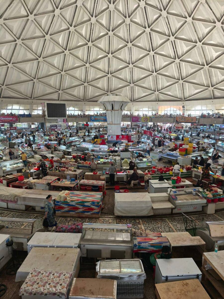Рынок Чорсу — пожалуй, самый известный и точно один из самых древних рынков Ташкента. Это место — как отдельный мир На первом этаже — мясо, молочные продукты, масла. Поднимаешься выше — специи, сухофрукты, орехи, лепёшки. Уличные ряды вообще отдельная история: шашлыки, плов, самса. Там пахнет так, что невозможно уйти голодным. Чорсу — это не просто торговая площадка. Здесь видно сам ритм города: шум, переговоры, улыбки продавцов, которые щедро угощают попробовать товар. Всё ярко, открыто и по-восточному тепло. ❓ Несколько интересных фактов про рынок: 🔺 Само название «Чорсу» переводится как «четыре дороги» — рынок изначально возник на пересечении торговых путей. 🔺 Здесь торговали ещё сотни лет назад — рынок был частью Великого шёлкового пути. 🔺 Современное здание с куполом построили в советское время, в 80-х. Купол огромный — под ним можно разместить несколько футбольных полей. 🔺 Чорсу — это не только продукты. Здесь можно найти ковры, посуду, одежду и даже антиквариат. 🔺 Д