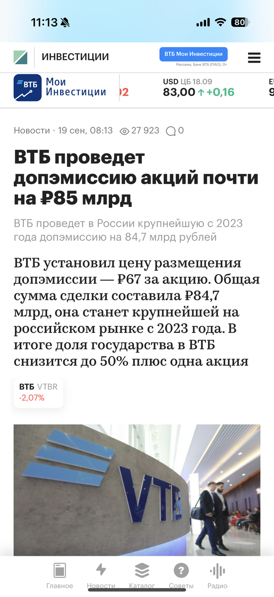 $VTBR провел рекордную сделку по размещению акций: банк привлек до 84,7 млрд рублей при общем спросе более 180 млрд. Это настолько много, что на период сделки весь рынок буквально высушили: инвесторы продавали другие бумаги, чтобы приобрести акции ВТБ с дисконтом к рыночной цене. При этом книга была покрыта в первый же день, что говорит об очень высоком интересе - и это несмотря на определенный негатив, который чувствуется к эмитенту исторически Институциональные инвесторы (банки, фонды, УК) забрали 58% размещения, остальное ушло физлицам, у которых средний процент аллокации составил 30% от объема поданных заявок. Цена размещения - 67 рублей (на момент написания акции торгуются по 71 рублю). Теперь в свободном обращении более 49% акций, хотя контроль сохранился у Российской Федерации. Полученные деньги банк направит на развитие и улучшение капитальной позиции ❓Так. И что дальше? Навеса я не жду: институционалы точно не будут скидывать акции довольно долго, заходят они с фундамен