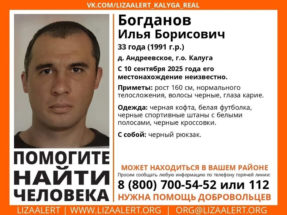 ▪️ В Калуге ищут мужчину с черным рюкзаком В деревне Андреевское пропал 33-летний Илья Богданов. В последний раз его видели еще 10 сентября. О поисках мужчины объявили в отряде "Лиза Алерт". Приметы пропавшего: рост 160 сантиметров, нормального телосложения, черные волосы, карие глаза. Был одет в черную кофту, белую футболку, черные спортивные штаны с белыми полосками, черные кроссовки. С собой у мужчины был черный рюкзак. Любую информацию о местонахождении Ильи Богданова просят сообщать по телефону горячей линии 8 800 700-54-52 или 112.