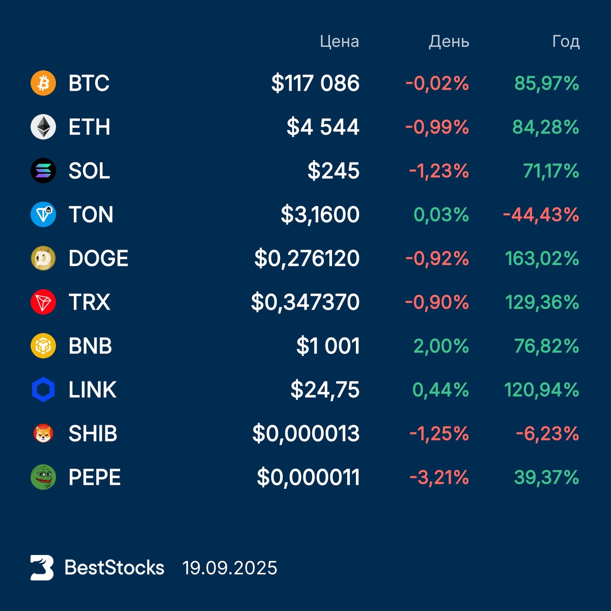 Курсы основных криптовалют: Bitcoin, Etherium, Solana, Toncoin, Dogecoin, TRON, BNB, Chainlink, Pepe, Shiba Inu на текущий момент #крипта #crypto #курс #BTC #ETH #SOL #TON #DOGE #TRX #BNB #LINKUSD #PEPEUSD #SHIBUSD ••••• ⚡️ Новый функционал на сайте — 🇷🇺 Какие русские акции в тренде. Узнайте, какие бумаги из России получили больше всего рекомендаций за последнюю неделю.