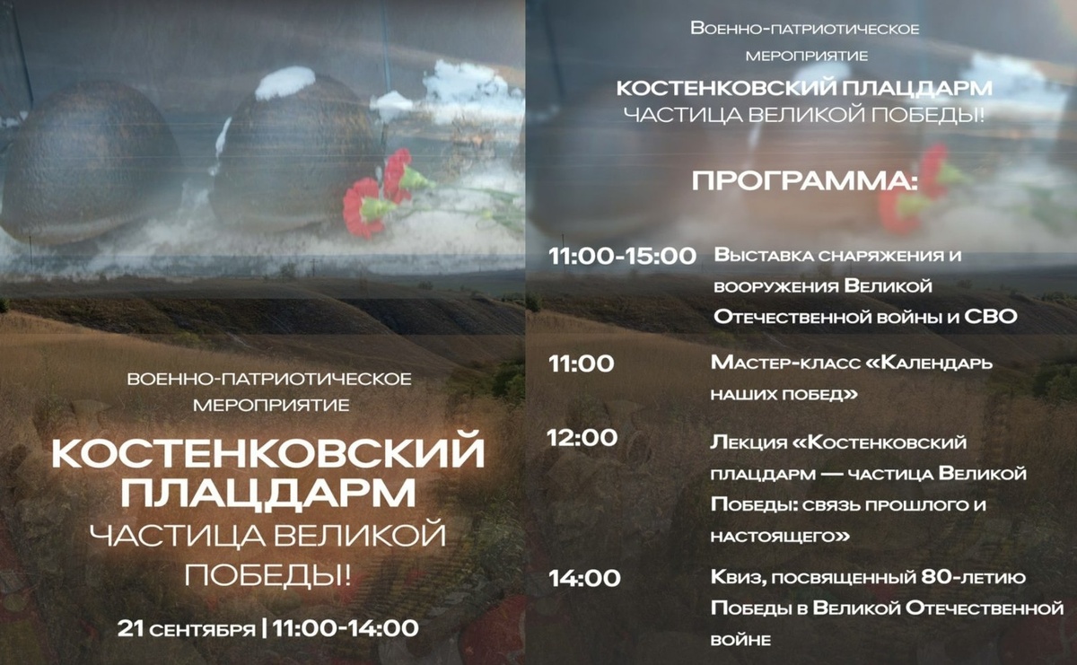 Патриотические мероприятия «Костенковский плацдарм — частица Великой Победы» пройдут 21 сентября в музее-заповеднике «Костенки». Совместно с клубом «ПЕРЕСВЕТ» будет организована насыщенная программа: Выставка вооружения 11:00–15:00 — Уникальная возможность увидеть снаряжение и оружие от Великой Отечественной до наших дней, включая образцы с реальных полей сражений. Мастер-класс «Календарь наших побед» 11:00 — Мастер-класс предлагает участникам под руководством музейного художника создать календарь, посвященный победам в Великой Отечественной войне. Лекция «Костенковский плацдарм — частица Великой Победы: связь прошлого и настоящего» 12:00 — Особое внимание будет уделено анализу событий, проведению параллелей с подвигами современных участников Специальной военной операции и осмыслению героизма людей, которые формировали историю страны. Квиз к 80-летию Победы 14:00 — Викторина познакомит участников с ключевыми событиями и героями войны, проверит знания о битвах, стратегических решен