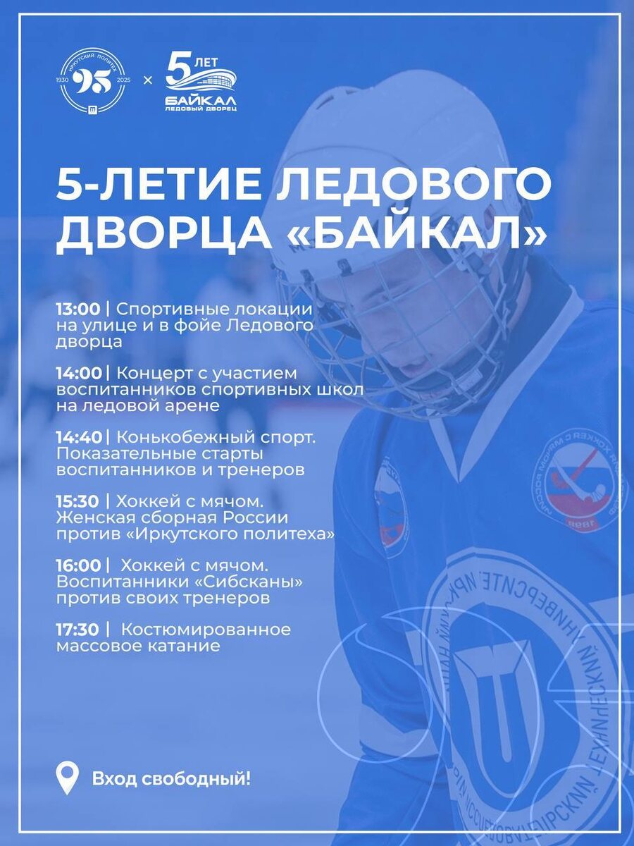 Юбилей ледового дворца «Байкал» ✨ С радостью приглашаем на торжественное празднование юбилея ледового дворца «Байкал»! Дата: 20 сентября Время: 13:00 Место: Ледовый дворец «Байкал» (ул. Лермонтова 249) В программе праздника вас ждет фотозона, концерт и много других сюрпризов! Подробности смотрите в афише ➡️ В честь юбилея хоккейная команда «Иркутский политех» сыграет товарищеский матч с сборной России по хоккею с мячом (жен.)🤩
