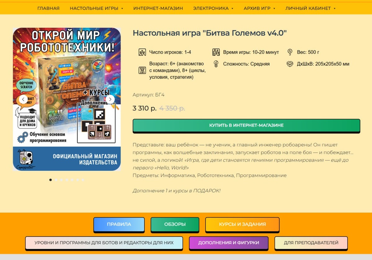 Страницы наших игр не просто реклама, а кладезь полезной информации. Например, на странице игры «Битва Големов» simplrobot.ru/bitvagolemov4 можете найти не только бумажные, но и аудиоправила, обзоры и подкасты по игре (в том числе и которые появятся скоро, Курсы и задания по данной игре, Каталог уровней и программ для Ботов, Редакторы для создания своих уровней и программ, бесплатные STL файлы для печати фигурок роботов и препятствий на 3D принтере, а также методику и полезные материалы для преподавателей. Также мы наполняем контентом и страницы других игр: «Не закороти Цепь!» и «Сон Менделеева».