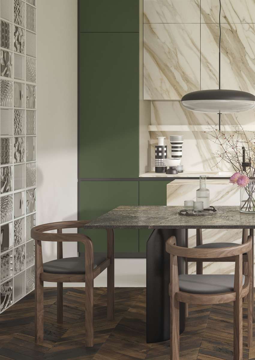 2. Сочетание со столешницей. Гармония между фартуком и столешницей — условие сбалансированного интерьера. Можно выбрать единство в цвете и стиле, создавая целостный образ, либо сыграть на контрасте, используя, например, светлую столешницу из керамогранита SapienStone в сочетании с темной плиткой.