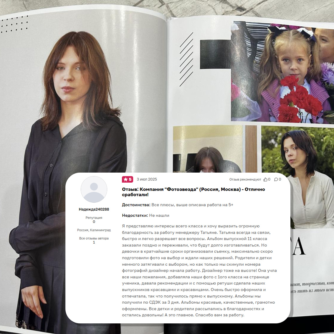 Достоинства: Все плюсы, выше описана работа на 5+ Недостатки: Не нашли Я представляю интересы всего класса и хочу выразить огромную благодарность за работу менеджеру Татьяне. Татьяна всегда на связи, быстро и легко разрешает все вопросы. Альбом выпускной 11 класса заказали поздно и переживали, что будут долго изготавливаться. Но девочки в кратчайшие сроки организовали съемку, максимально скоро подготовили фото на выбор и ждали наших решений. Родители и детки немного затягивали с выбором, но как только мы скинули номера фотографий дизайнер начала работу. Дизайнер тоже на высоте! Она учла все наши пожелания, добавляла наши фото с 1ого класса на странице ученика, давала рекомендации и с помощью ретуши сделала наших выпускников красавцами и красавицами. Очень быстро оформила и отпечатала, так что получилось прямо к выпускному. Альбомы мы получили по СДЭК за 3 дня. Альбомы красивые, качественные, грамотно оформлены. Все детки и родители рассыпались в благодарностях и остались довольны! А э
