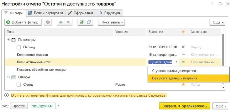 💡 Пример: Товар учтен в штуках и килограммах - отчет покажет общее число (например, 150 шт. + 20 кг = 170).