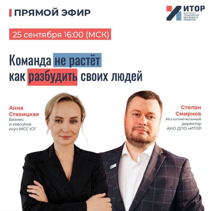 🔴 Прямой эфир: “Команда не растёт: как разбудить своих людей” 📅 25 сентября, 16:00 (МСК) Лидерство невозможно без команды. У каждого сильного лидера есть люди, которые идут вместе с ним, разделяют его цели, ценности и усилия. Но что делать, если команда перестаёт расти? Если кажется, что люди устали, погрузились в рутину и перестали генерировать идеи? Совсем недавно, в летнем выпуске журнала «Аудитория №8» вышла статья Анны Ставицкой о современном лидерстве. И мы решили пойти дальше — рассмотреть тему шире и глубже: поговорить не только о лидерстве, но и о том, как работать с командой, когда рост буксует. 💡 В прямом эфире встретятся два человека, чья профессиональная история связана уже больше 8 лет: • Анна Ставицкая — бизнес- и executive-коуч MCC ICF, одна из первых наставников Степана в T&D, человек, оставивший заметный след в его становлении. • Степан Смирнов — исполнительный директор АНО ДПО «ИТОР», который прошёл путь от первых шагов в профессии до управления организациями и