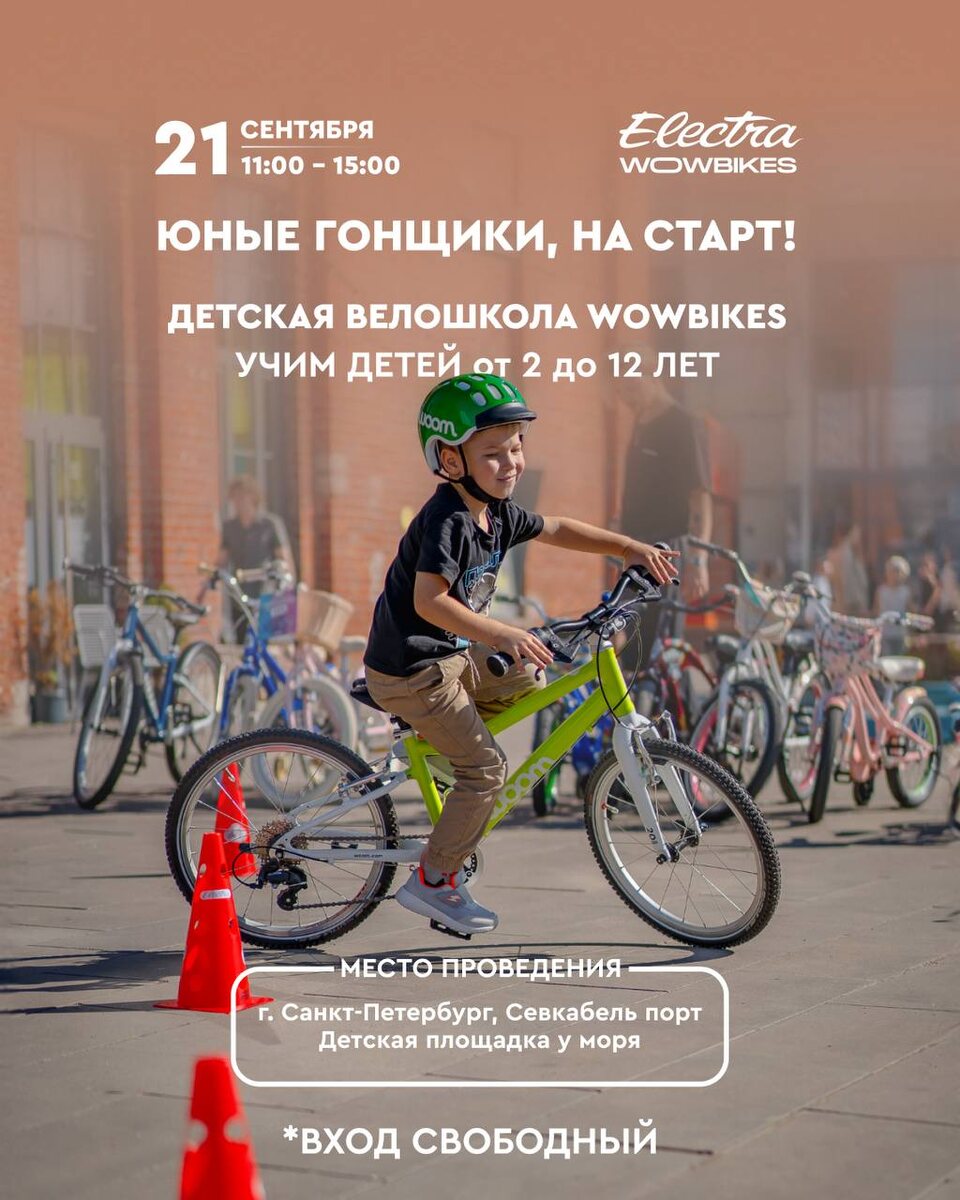 Юные гонщики, на старт! Завершаем тёплый сезон в детской велошколе от Wowbikes🚲 🗓️Когда: 21 сентября, 11:00-15:00 👶🏼Для кого: Дети от 2 до 12 лет Под руководством профессиональных инструкторов дети изучат основы безопасного катания и освоят базовые навыки управления на стильных и надёжных велосипедах Electra, Woom и Spinn Pixie. ⏰Тайминг мероприятия: 11:00 – Инструктаж по безопасности и распределение детей по возрастным группам; 11:30 – Индивидуальное и групповое обучение основам баланса для малышей, переходу с беговела, а также торможению, поворотам и маневрированию; 12:30 – Полоса препятствий: интерактивная трасса для практики новых навыков; 13:30 – Мини-гонка: безопасное соревновании по возрастным группам; 14:30 – Свободное катание и консультации для родителей Вход свободный! Ждём всех на свежем воздухе для активного и полезного отдыха. 📍Санкт-Петербург, Севкабель Порт, детская площадка у моря