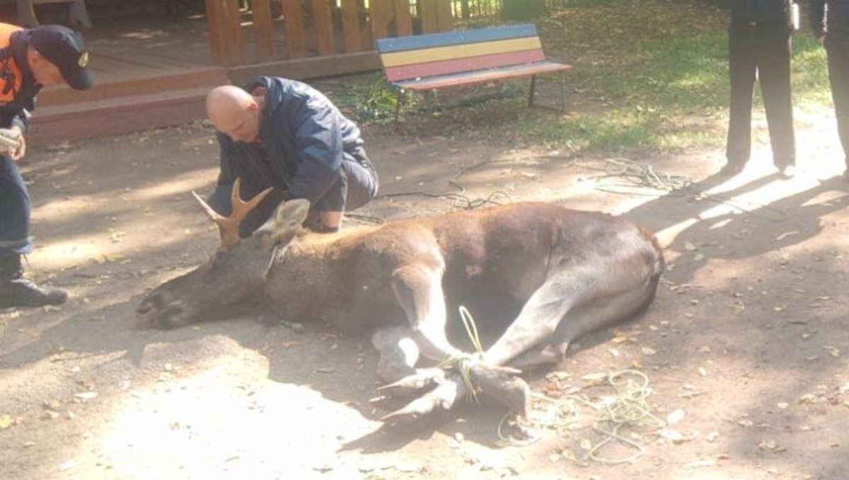 Лось, появившийся утром на территории детского сада № 218 в Уфе, наконец пойман. Дмитрий Стрельников, руководитель центра реабилитации диких животных «Пин и Пуф», уточнил в соцсетях: «Он жив, в него не стреляли. Животное усыпили и обезопасили». Теперь лося планируют погрузить в специальный транспорт, вывезти за пределы города и там вернуть в сознание. Источник и фото: Дмитрий Стрельников, центр реабилитации диких животных «Пин и Пуф».