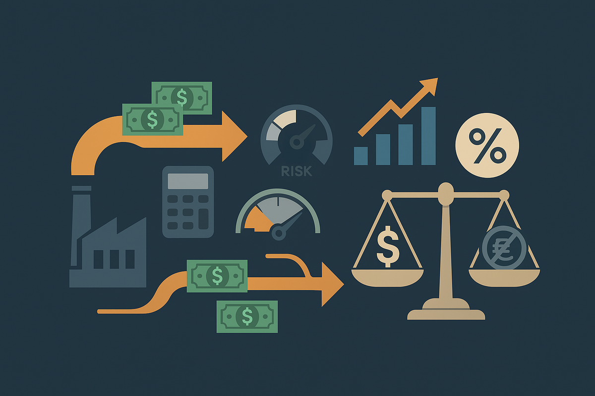 Бета (β) — чувствительность доходности бизнеса к рынку — берётся из регрессий или отраслевых бенчмарков. Её «разлепляют» (unlevered), усредняют по аналогам, а затем «залепляют» (relevered) под целевую структуру капитала. Для развивающихся рынков добавляют страновой риск и премии за размер/ликвидность.