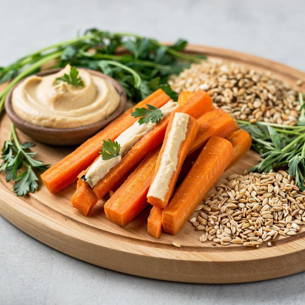 Приветствую вас в моей виртуальной кухне! Сегодня приготовим простой, вкусный и полезный перекус, который понравится и взрослым, и детям. Речь пойдет о морковных палочках с ароматным хумусом. ▌ Почему именно морковь? Морковь богата витаминами А, Е, С и антиоксидантами, которые укрепляют иммунитет, улучшают зрение и состояние кожи. Этот овощ также низкокалориен, поэтому подходит для тех, кто следит за фигурой. Палочки удобно брать с собой на работу или учебу, они идеально подходят для быстрого перекуса. ▌ Что такое хумус? Хумус — это традиционная закуска ближневосточной кухни, приготовленная из нута, оливкового масла, лимонного сока и специй. Его любят за нежную кремовую текстуру и приятный вкус. Хумус богат белком, клетчаткой и полезными жирами, что делает его отличным дополнением к здоровому рациону. ▌ Ингредиенты: ▌ Для морковных палочек: - Свежая морковь — 3 шт. ▌ Для хумуса: - Нут консервированный или отваренный — 400 г - Оливковое масло — 3 ст.л. - Лимонный сок — 2 ст.л. - Чеснок