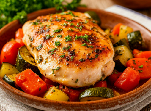 Запеченное куриное филе с овощами — это идеальное блюдо для правильного питания, сытного ужина без лишних хлопот. Оно сочное, ароматное и очень полезное. Куриное филе, запеченное с овощами: просто и вкусно Главный секрет этого блюда — в маринаде и правильном времени приготовления, чтобы курочка осталась сочной, а овощи — аппетитными и с легкой корочкой. Ингредиенты (на 3-4 порции) Основное: * **Куриное филе** — 2 больших или 3 средних шт. (около 500-600 г) * **Кабачок (или цукини)** — 1 средний * **Болгарский перец** — 1-2 шт. (разных цветов) * **Лук репчатый (красный или белый)** — 1 крупная головка * **Помидоры черри** — 150-200 г (можно заменить обычным помидором, нарезанным дольками) * **Чеснок** — 3-4 зубчика Для маринада: * **Оливковое масло** — 3-4 ст. ложки * **Соевый соус** — 2 ст. ложки (или соль по вкусу, ~1 ч.л.) * **Лимоный сок** или **бальзамический уксус** — 1 ст. ложка * **Паприка молотая (копченая или обычная)** — 1 ч. ложка * **Сушеные прованск